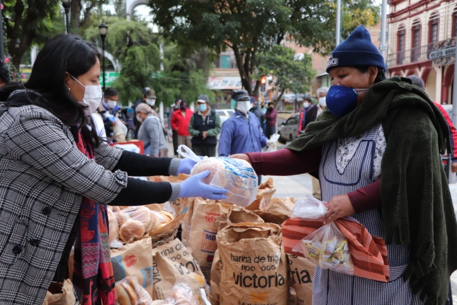 El Gobierno Autónomo Municipal Sacaba en coordinación con la Asociación de Panificadores de esta jurisdicción, realizó la entrega de 17 mil unidades de Pan de batalla y 25 mil bolsitas de maní elaborados por la empresa (APROMAN) para ayudar a alimentar a familias más necesitadas y de escasos recursos que viven a consecuencia de la cuarentena total por la pandemia del COVID – 19, producto fue entregado en la plaza principal y en distintos distritos urbanos y rurales.